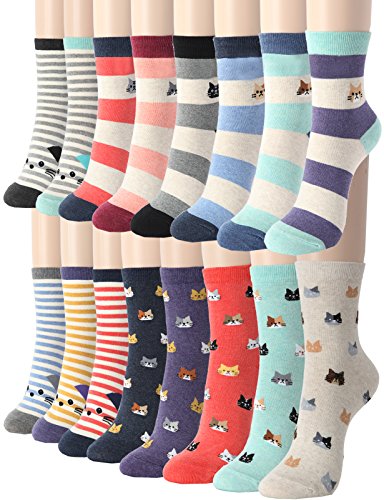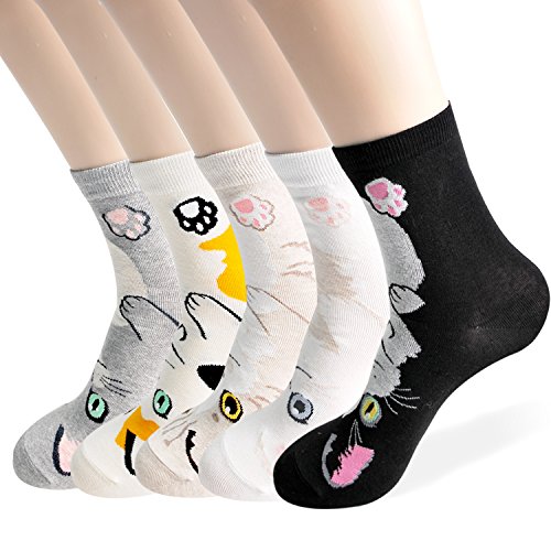 Meta-U Cute Cat Design Women’s Casual Comfortable Cotton Crew Socks – 5 Pack