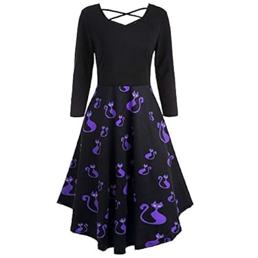 JPOQW Halloween Costume Women Long Sleeve Dress Cross Hollow Cat Print Dresses
